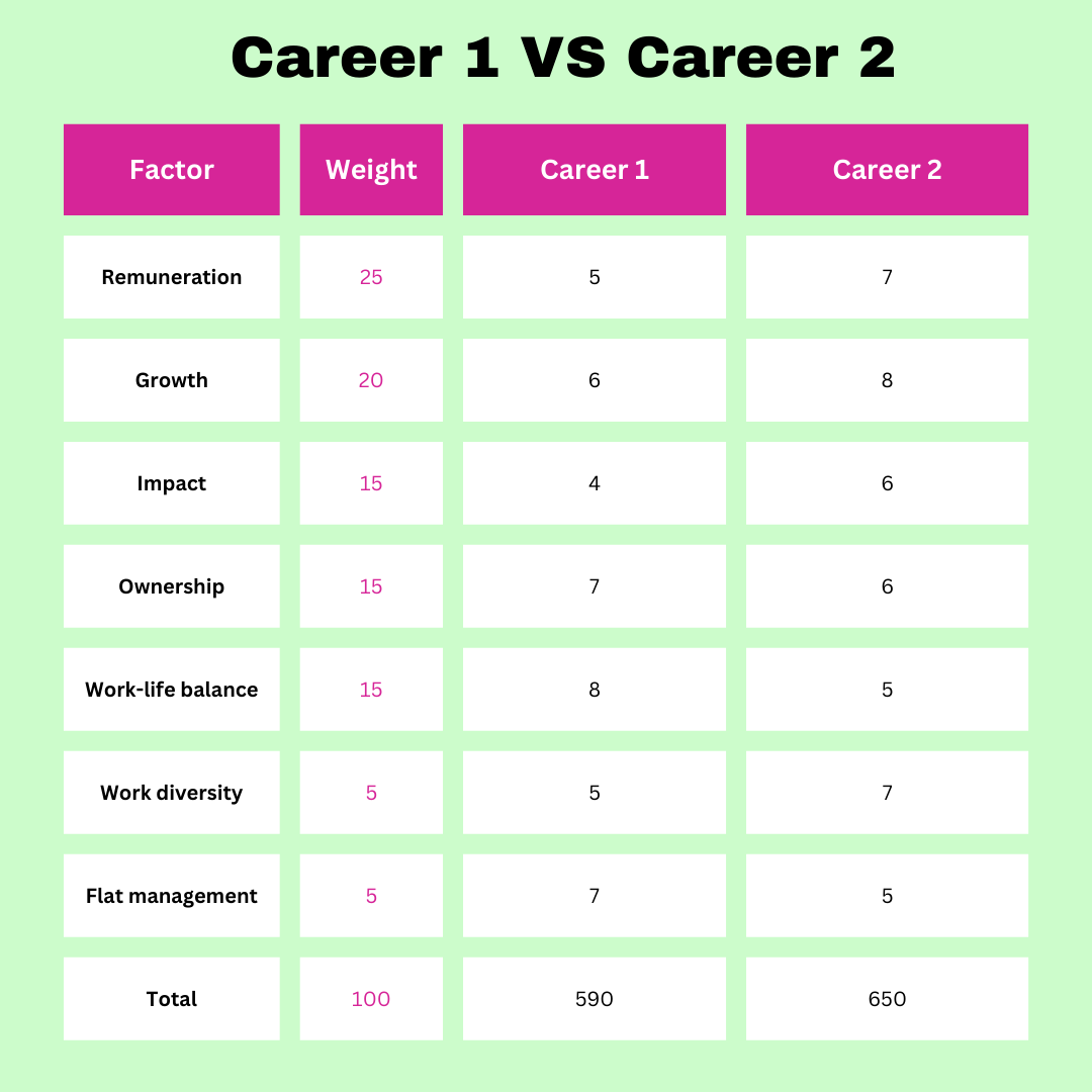 I weigh each factor to determine each level of importance (With 100 as the total), e.g. “Remuneration” is 25/100.